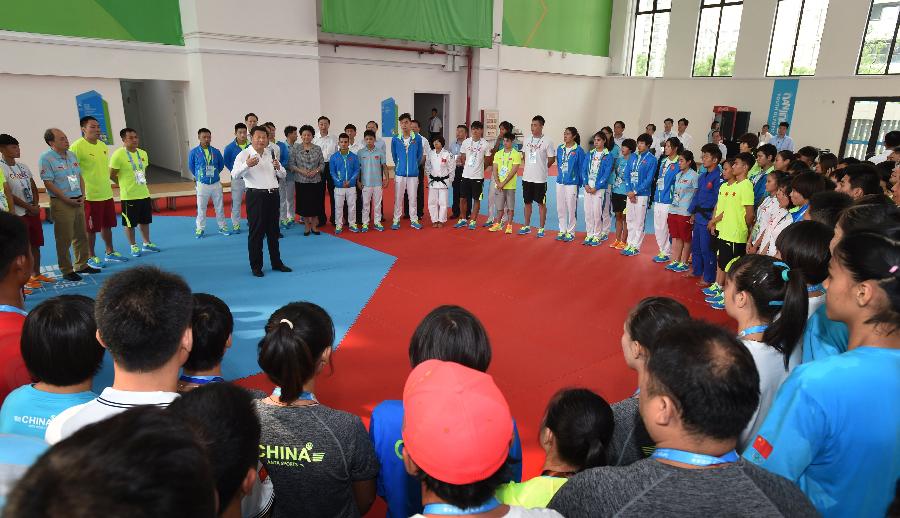 Chinese President Xi Jinping (C) visits the Chinese Youth Olympic delegation at the Nanjing Youth Olympic Village (YOV) in Nanjing, capital of east China's Jiangsu province, Aug. 15, 2014. (Xinhua/Ma Zhancheng)