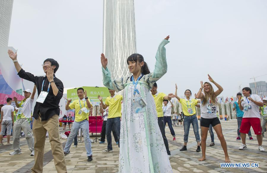 Athletes dance following volunteers in the Youth Olympic Village of Nanjing 2014 Olympic Games in Nanjing, capital of east China's Jiangsu Province, on Aug. 15, 2014. (Xinhua/Chen Cheng)