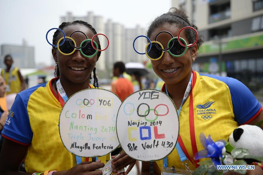 Nhayila Renteria Cuesta (L) and Giseth Montano Saenz of Colombia, pose for a photo with their glasses in the shape of Olympic rings in the Youth Olympic Village of Nanjing 2014 Olympic Games in Nanjing, capital of east China's Jiangsu Province, on Aug. 15, 2014. (Xinhua/Ju Huanzong)