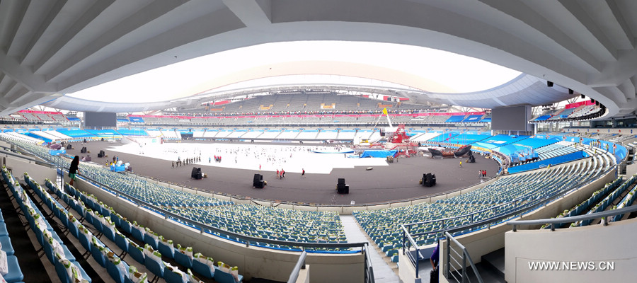 Photo taken on August 16, 2014 shows the rehearsal of Youth Olympic Games (YOG) in Nanjing Olympic Sports Center. The opening ceremony of YOG will start at 8:00 pm on August 16, 2014. (Xinhuanet/Wang Hanlin)
