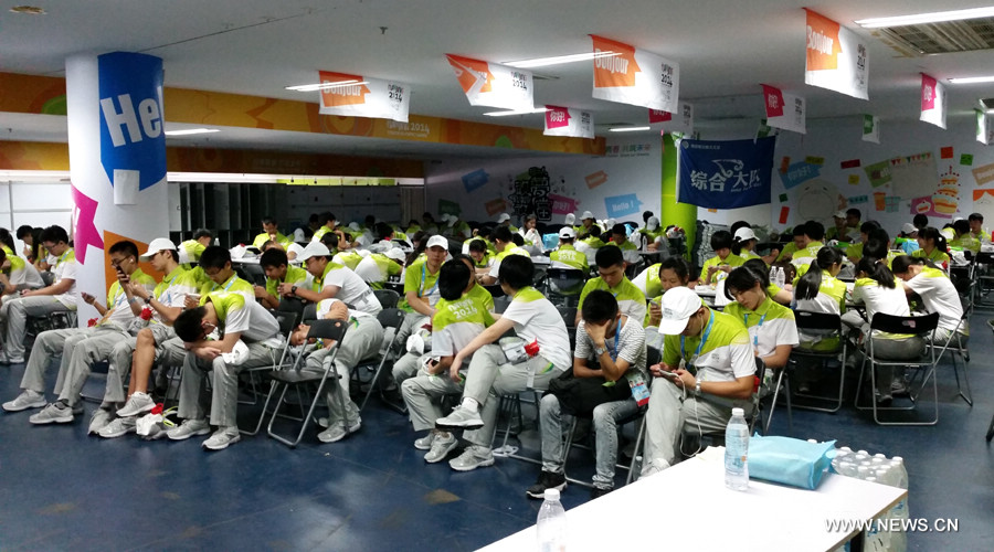 Volunteers prepare for the rehearsal of Youth Olympic Games (YOG) in Nanjing Olympic Sports Center. The opening ceremony of YOG will start at 8:00 pm on August 16, 2014. (Xinhuanet/Wang Hanlin)