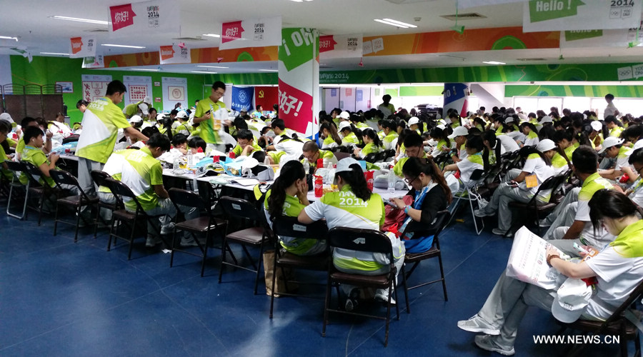 | Volunteers wait for the rehearsal of Youth Olympic Games (YOG) in Nanjing Olympic Sports Center. The opening ceremony of YOG will start at 8:00 pm on August 16, 2014. (Xinhuanet/Wang Hanlin) |
