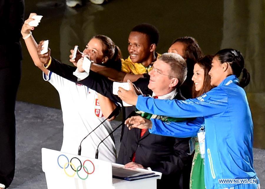 IOC President Thomas Bach (C) takes selfies with athletes by their mobilphones during the opening ceremony for Nanjing 2014 Summer Youth Olympic Games in Nanjing, capital of east China's Jiangsu Province, Aug. 16, 2014. (Xinhua/Guo Yong)
