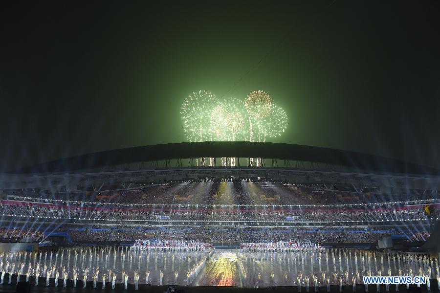Fireworks explode during the Nanjing 2014 Youth Olympic Games opening ceremony in Nanjing, capital of east China’s Jiangsu Province. (Xinhua/Han Yuqin)