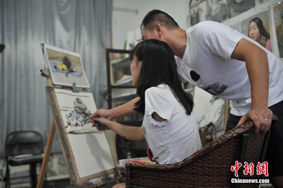 One-armed girl Yong Qian is practicing painting under the guidance of A Dan, a kindhearted painting teacher, on August 16, 2014.(Photo/CNS)