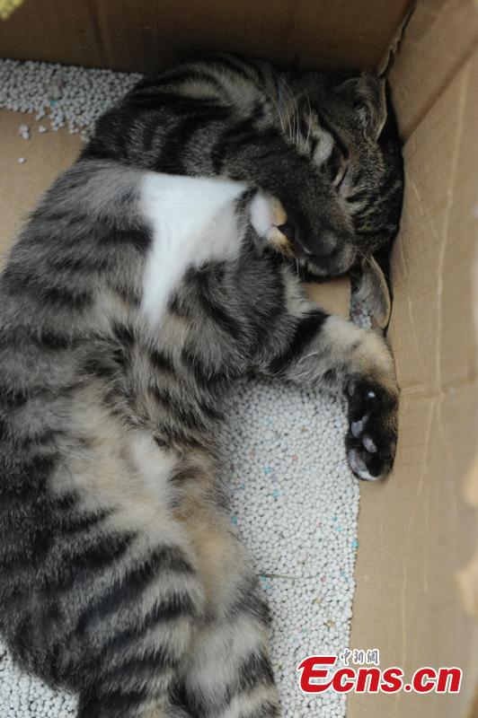 A cat is seen at the 13th Changchun International Agricultural Products Trade Fair in Changchun city of northeast China's Jilin province on Aug. 18, 2014. [Photo/Zhang Yao]
