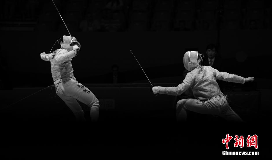 Russian athlete Ivan Ilin(R) competes with South Korean athlete Kim Dongju. Ilin beat Kim at the Gold Medal Bout of Men's Sabre Individual at YOG on Aug. 17, 2014. (CNS/Hou Yu)