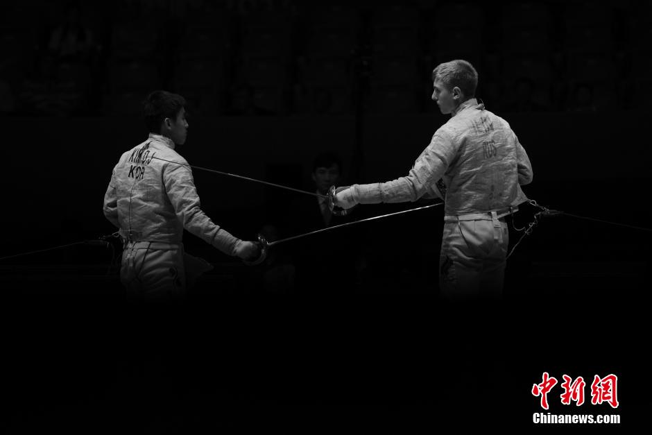 Russian athlete Ivan Ilin (R) and South Korean athlete Kim Dongju examine sensing systems. Ilin beat Kim at the Gold Medal Bout of Men's Sabre Individual at YOG on Aug. 17, 2014. Two athletes (CNS/Hou Yu)