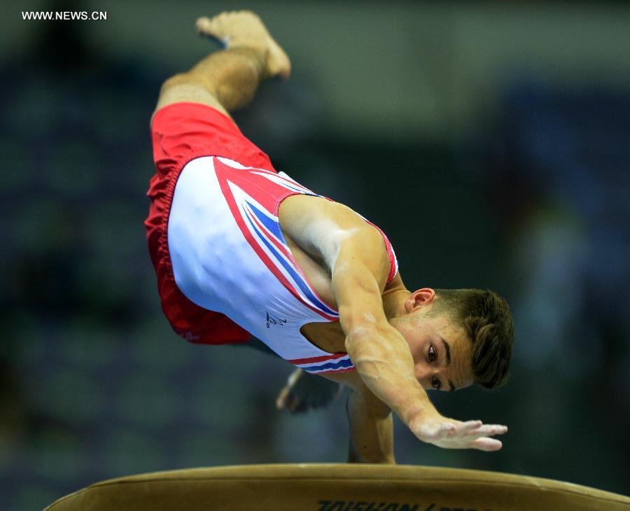 Gold medalist Giarnni Regini-Moran of Great Britain competes in the men's all-around final of artistic gymnastics at the 2nd Summer Youth Olympic Games (YOG) in Nanjing, capital of east China's Jiangsu Province, August 19, 2014. (Xinhua/Cheng Min)
