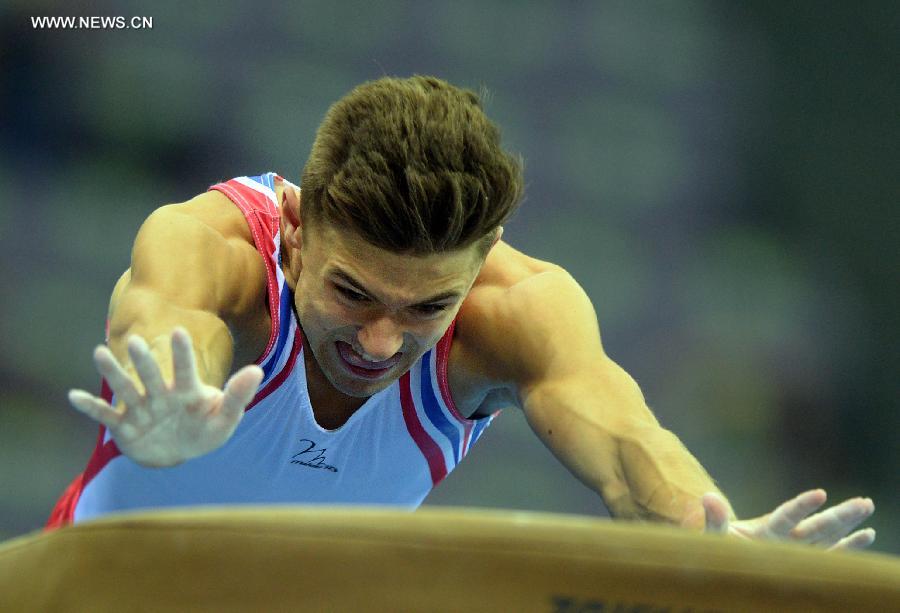 Gold medalist Giarnni Regini-Moran of Great Britain competes in the men's all-around final of artistic gymnastics at the 2nd Summer Youth Olympic Games (YOG) in Nanjing, capital of east China's Jiangsu Province, August 19, 2014. (Xinhua/Cheng Min)