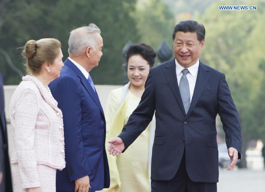 Chinese President Xi Jinping (1st R) and his wife Peng Liyuan (2nd R) greet visiting Uzbekistan's President Islam Karimov (2nd L) and his wife Tatyana Karimova during a welcoming ceremony in Beijing, capital of China, Aug. 19, 2014. (Xinhua/Huang Jingwen)