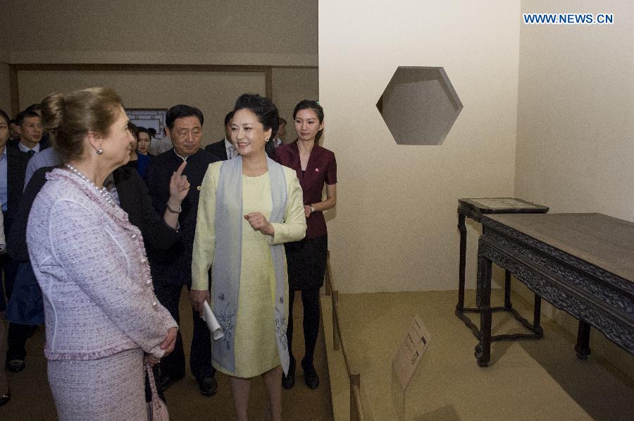 | Peng Liyuan (R, front), wife of Chinese President Xi Jinping, talks with Tatyana Karimova (L, front), the First Lady of Uzbekistan, during their visit to the National Museum of China in Beijing, capital of China, Aug. 19, 2014. (Xinhua/Wang Ye) |