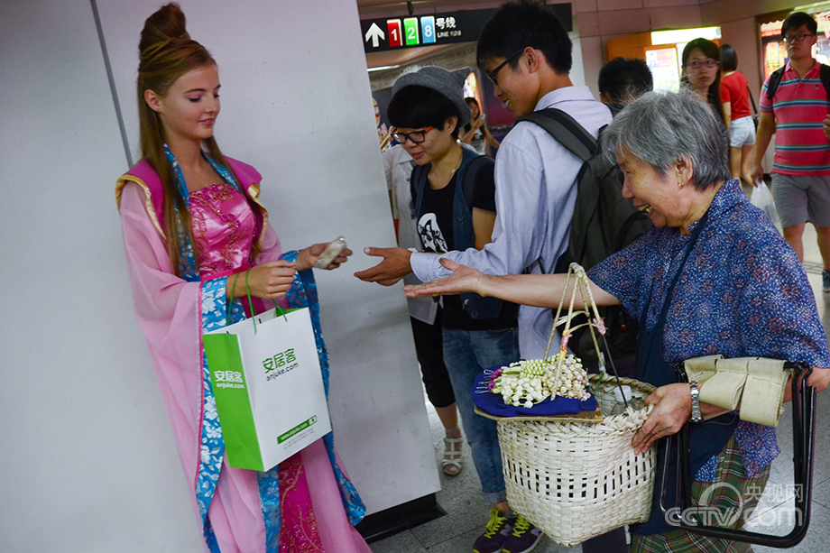 A foreigner in ancient Chinese costume distributes moon cakes to the passengers at the People’s Square Station in Shanghai on Sept. 17, 2013. (Photo/CNTV)