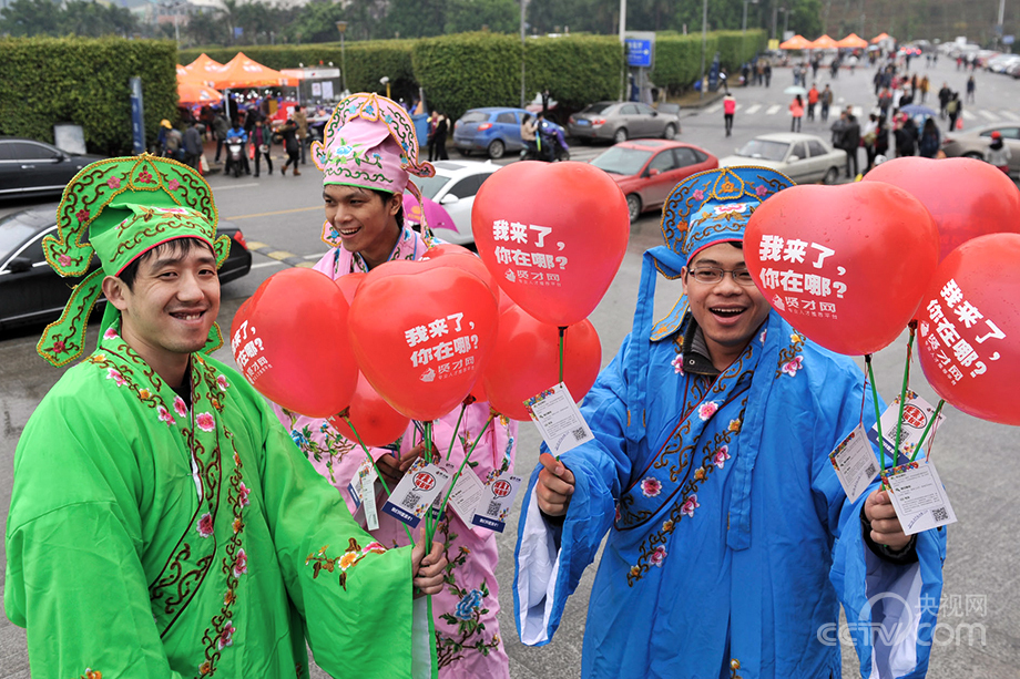 Three "ancient genius" attract job seekers’ attention at a job fair in Guangxi on Feb 22, 2014. (Photo/CNTV)