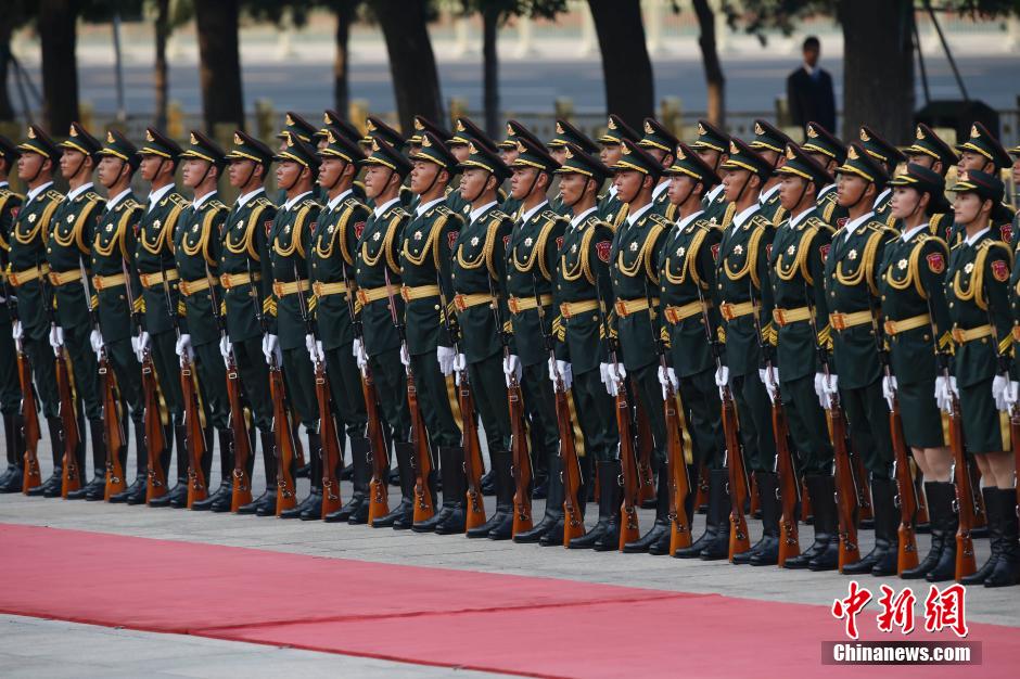 The Guard of Honor of the People's Liberation Army wearing the new type of uniform is reviewed at the welcome ceremony on Aug. 19, 2014. (CNS/Du Yang)
