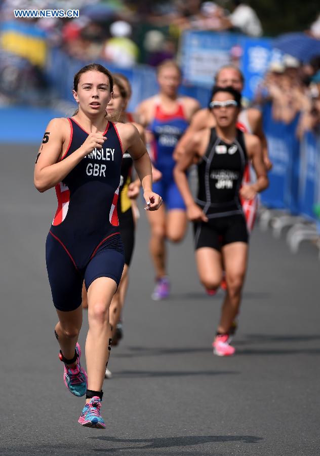 Great Britain's Sian Rainsley (L) of Europe 3 competes during the 4X Mixed Relay's Final of triathlon event at the 2014 Nanjing Youth Olympic Games in Nanjing, east China's Jiangsu Province, on August 21, 2014.Europe 3 won the silver . (Xinhua/Yan Yan)