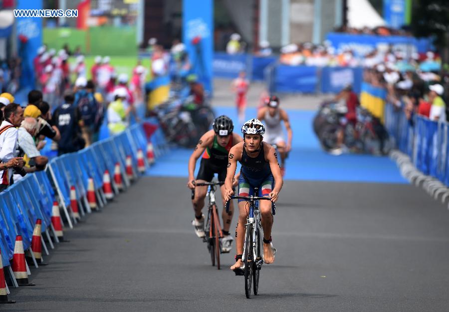 Italy' s Guilio Soldati (F) of Europe 3 competes during the 4X Mixed Relay's Final of triathlon event at the 2014 Nanjing Youth Olympic Games in Nanjing, east China's Jiangsu Province, on August 21, 2014.Europe 3 won the silver . (Xinhua/Yan Yan)