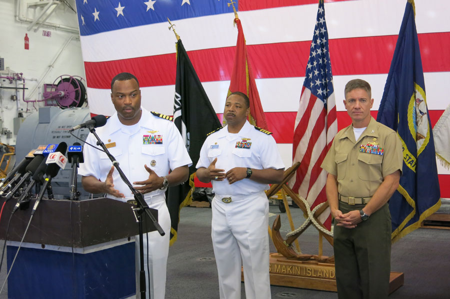 (From left to right) Commanding Officer Capt. Alvin Holsey of USS Makin Island (LHD 8), Commodore Capt. Victor Cooper with Makin Island Amphibious Ready Group (ARG), and Commanding Officer Col. Matthew Trollinger with 11th Marine Expeditionary Unit, meet with the press. [Photo: CRIENGLISH.com]