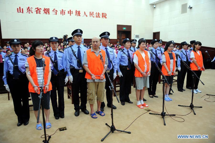 Five cult members Zhang Fan, Zhang Lidong, Lyu Yingchun, Zhang Hang and Zhang Qiaolian stand trial on murder charges in Yantai Intermediate People's Court in Yantai City, east China's Shandong Province, Aug. 21, 2014. A woman surnamed Wu was beaten to death on May 28 at a McDonald's outlet in Zhaoyuan City, Yantai, after she refused to give her telephone number to the suspects, who were allegedly trying to recruit new members for their cult Quannengshen, which means "almighty god." (Xinhua)