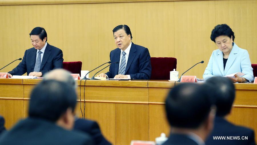 | Liu Yunshan(C), a member of the Standing Committee of the Political Bureau of the Communist Party of China (CPC) Central Committee and secretary of the Secretariat of the CPC Central Committee, addresses a symposium to mark the upcoming 110th anniversary of the birth of late Chinese leader Deng Xiaoping, which falls on Friday, in Beijing, capital of China, Aug. 21, 2014. Deng was born on Aug. 22, 1904 in southwest China's Sichuan Province. He was called the "chief architect of China's reform and opening-up" for his painstaking efforts in leading the country's modern-day transformation starting in the 1970s. (Xinhua/Yao Dawei) |