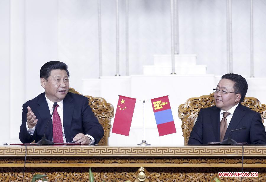 | Chinese President Xi Jinping (L) and his Mongolian counterpart Tsakhiagiin Elbegdorj jointly meet with journalists after their talks in Ulan Bator, Mongolia, Aug. 21, 2014. Xi arrived in Ulan Bator Thursday for a two-day state visit to Mongolia. (Xinhua/Ju Peng) |
