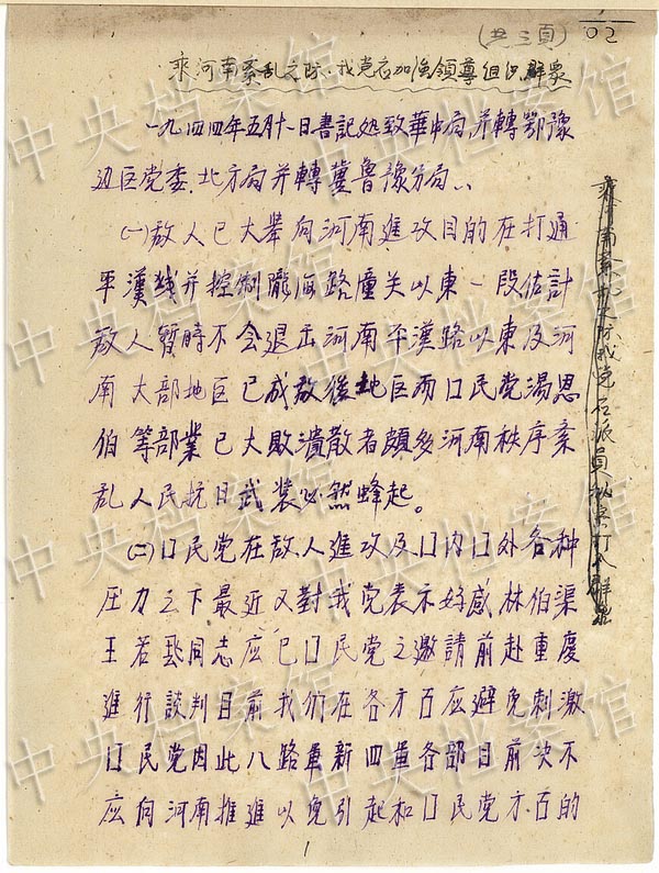 The Administration)he Secretariat of the Central Committee of the Communist Party of China gave an instruction on expanding military presence in Henan province in May 1944. (Photo/China's State Archive)