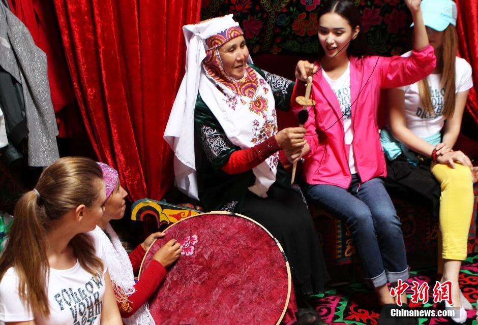 Models participating in the New Silk Road international image ambassadors contest went to Qansuh town and Narat town, Xinyuan county, to celebrate the 60th founding anniversary of Yili prefecture in Xinjiang on Aug. 4, 2014. They experienced the local ethnic customs in Kazak families.