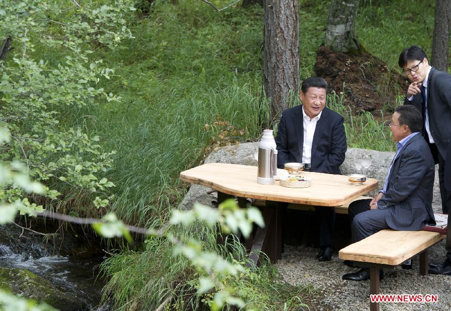 | Chinese President Xi Jinping (L) drinks tea with his Mongolian counterpart Tsakhiagiin Elbegdorj after their talks in Ulan Bator, Mongolia, Aug. 22, 2014. (Xinhua/Huang Jingwen) |