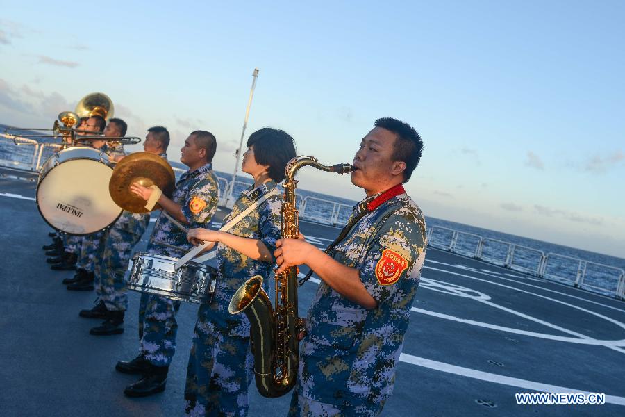 Members of the military band of the Peace Ark, hospital ship of China's People's Liberation Army Navy, perform in Hawaii, the United States, July 28, 2014. The Peace Ark arrived in Fijian capital Suva on Friday, kicking off its week-long medical assistance mission in the South Pacific island country. With a full-load displacement of 14,220 tonnes, the Peack Ark, commissioned in 2008, is equipped with some 300 beds, eight operating rooms and over 200 types of medical devices including CT, color ultrasonic, automatic biochemistry analyzer, etc. (Xinhua/Qin Haishi)