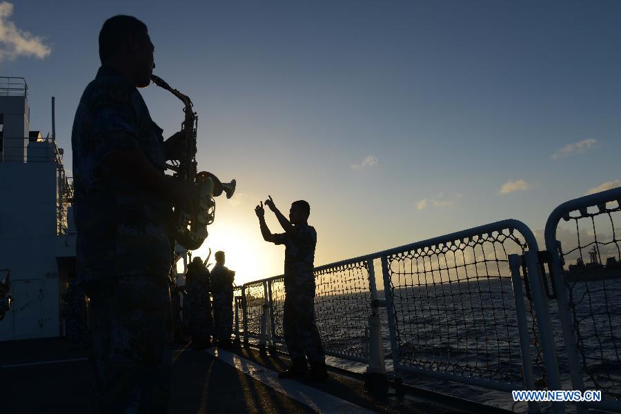 Members of the military band of the Peace Ark, hospital ship of China's People's Liberation Army Navy, perform in Hawaii, the United States, July 28, 2014. The Peace Ark arrived in Fijian capital Suva on Friday, kicking off its week-long medical assistance mission in the South Pacific island country. With a full-load displacement of 14,220 tonnes, the Peack Ark, commissioned in 2008, is equipped with some 300 beds, eight operating rooms and over 200 types of medical devices including CT, color ultrasonic, automatic biochemistry analyzer, etc. (Xinhua/Qin Haishi)