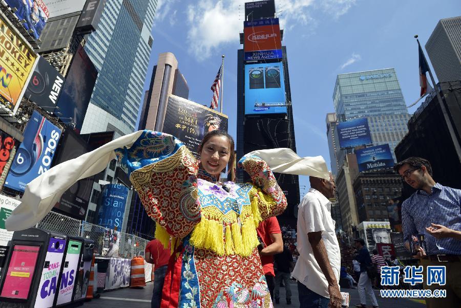 Peking opera actress Wang Mengting, dressed in opera costume, promotes the art of Peking opera to people at the Times Square, NYC. (Xinhuanet/Wang Lei)