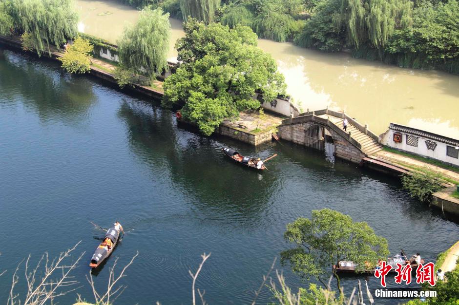 Photo taken on Aug.21, 2014 shows a river that boasts different water quality conditions in Shaoxing city, east China's Zhejiang province. On one side of the wall, tourists enjoy beautiful landscapes on a bridge over the clear water at the city's Donghu Scenic Zone. However, on the other side of the wall, the water of the river looks yellow due to pollution and sediments transported by mountain torrents after consistent heavy rains in the region. (Photo: China News Service/Li Ruichang)