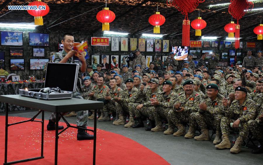 Foreign participants watch the magic show performed by a Chinese soldier ahead of the Peace Mission-2014 anti-terror drill at the Zhurihe training base, north China's Inner Mongolia Autonomous Region, Aug. 23, 2014. The drill will be held from Aug. 24 to Aug. 29 among troops from China, Russia, Kazakhstan, Kyrgyzstan and Tajikistan. (Xinhua/Zhang Ling)