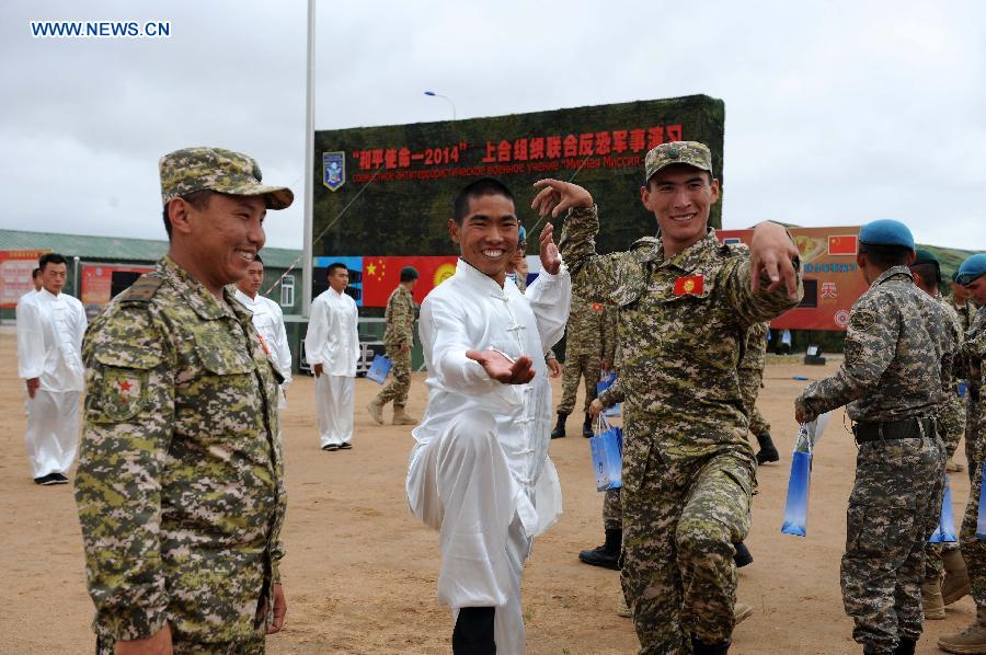 Soldiers from Kyrgyzstan join in the performance of Chinese martial exercise of Tai Chi ahead of the Peace Mission-2014 anti-terror drill at the Zhurihe training base, north China's Inner Mongolia Autonomous Region, Aug. 23, 2014. The drill will be held from Aug. 24 to Aug. 29 among troops from China, Russia, Kazakhstan, Kyrgyzstan and Tajikistan. (Xinhua/Zhang Ling)
