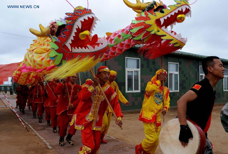 | Chinese soldiers perform the dragon dance for foreign participants ahead of the Peace Mission-2014 anti-terror drill at the Zhurihe training base, north China's Inner Mongolia Autonomous Region, Aug. 23, 2014. The drill will be held from Aug. 24 to Aug. 29 among troops from China, Russia, Kazakhstan, Kyrgyzstan and Tajikistan. (Xinhua/Zhang Ling) |