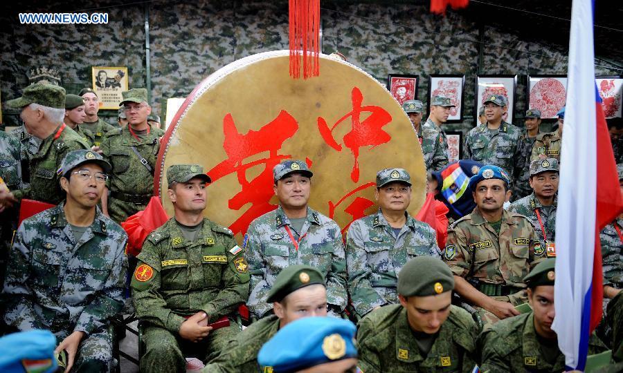 Wang Ning (3rd L), chief director of the anti-terror drill and deputy chief of the People's Liberation Army (PLA) general staff, watch the performance of traditional Chinese art ahead of the Peace Mission-2014 anti-terror drill at the Zhurihe training base, north China's Inner Mongolia Autonomous Region, Aug. 23, 2014. The drill will be held from Aug. 24 to Aug. 29 among troops from China, Russia, Kazakhstan, Kyrgyzstan and Tajikistan. (Xinhua/Zhang Ling)
