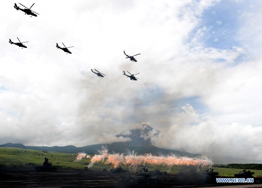 The Japanese Ground Self-Defense Forces (GSDF) attend live-fire drill at foothill of Mt. Fuji, Aug. 24, 2104. The Japanese GSDF on Sunday held an annual live-fire military drill in the GSDF maneuver field at the foothill of Mount Fuji in Gotemba city in Shizuoka Prefecture, with the participation of Defense Minister Itsunori Onodera. (Xinhua/Ma Ping)