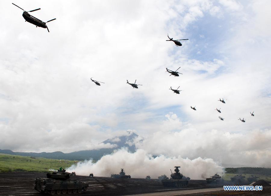 The Japanese Ground Self-Defense Forces (GSDF) attend live-fire drill at foothill of Mt. Fuji, Aug. 24, 2104. The Japanese GSDF on Sunday held an annual live-fire military drill in the GSDF maneuver field at the foothill of Mount Fuji in Gotemba city in Shizuoka Prefecture, with the participation of Defense Minister Itsunori Onodera. (Xinhua/Ma Ping)