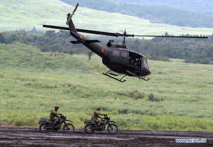 The Japanese Ground Self-Defense Forces (GSDF) attend live-fire drill at foothill of Mt. Fuji, Aug. 24, 2104. The Japanese GSDF on Sunday held an annual live-fire military drill in the GSDF maneuver field at the foothill of Mount Fuji in Gotemba city in Shizuoka Prefecture, with the participation of Defense Minister Itsunori Onodera. (Xinhua/Ma Ping)