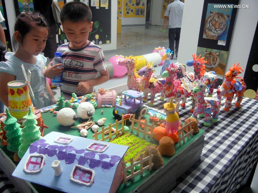 Young visitors look at cloth artworks during the First Suzhou International Children's Visual Arts Biennial Exhibition in Suzhou, east China's Jiangsu Province, Aug. 24, 2014. Over 1,000 visual artworks done by kids around the world will be shown during the First Suzhou International Children's Visual Arts Biennial Exhibition, which is available from Aug. 23 to Sept. 14 in Suzhou. (Xinhua/Wang Jiankang)