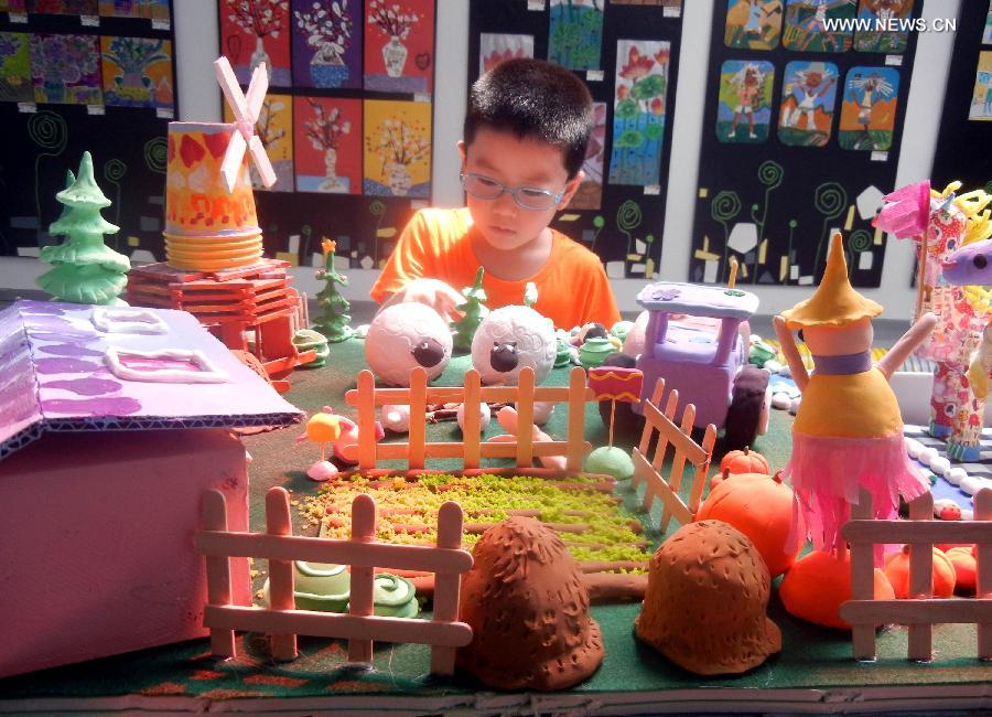 A young visitor looks at an installation artwork during the First Suzhou International Children's Visual Arts Biennial Exhibition in Suzhou, east China's Jiangsu Province, Aug. 24, 2014. Over 1,000 visual artworks done by kids around the world will be shown during the First Suzhou International Children's Visual Arts Biennial Exhibition, which is available from Aug. 23 to Sept. 14 in Suzhou. (Xinhua/Wang Jiankang)
