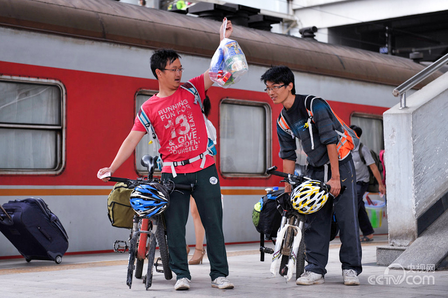 Deng Xinyu and Xian Chaoyang, college students from Guangdong province, start their travel on bicycle to Tibet on Aug. 10, 2013. (Photo/CNTV)