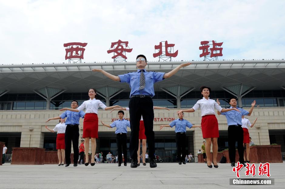 The stewards at Xi'an North Railway Station dance to "Little Apple" to welcome the passengers on Aug. 21, 2014, in Xi'an, northwest China's Shaanxi province. By the Chopsticks Brothers, "Little Apple" is one of the most popular songs in China. (Photo/CNS)
