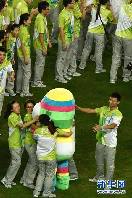 Volunteers hug "Lele", YOG mascot, in the carnival on Aug. 25, 2014. (Xinhua/Qu Dongqu)