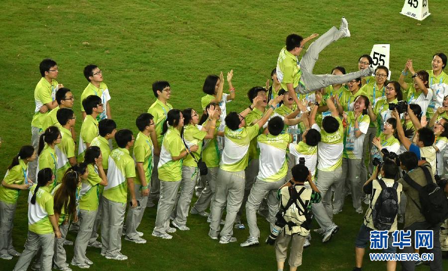 Volunteers enjoy themselves in the carnival on Aug. 25, 2014. (Xinhua/Qu Dongqu)