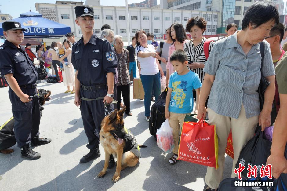 Two police dogs are on duty, searching for prohibited materials in the square of the railway station in Hohhot, capital of Inner Mongolia Autonomous Region on Aug. 26, 2014. Recently, 19 German shepherd dogs joined the police dog training team in the city. The police dogs have joined routine patrols in densely-populated areas. They are expected to help the police deal with terrorist attacks and keep order in large-scale gatherings. (China News Service/Liu Wenhua)