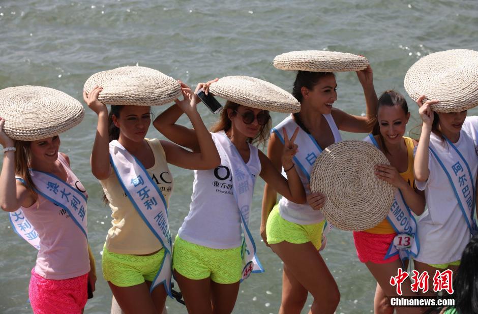 Contestants for the finals of the World Bikini Model Contest put the hassock on the head to block the sunshine in Qingdao on Aug. 25, 2014. (Photo/CNS)