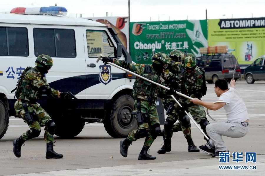 The frontier soldiers subdue "terrorist suspects" in the drill on Aug. 26, 2014. (Xinhua/Wang Xiaoxue)