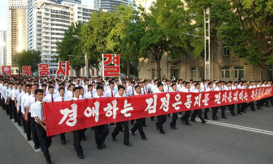 Photo provided by Korean Central News Agency (KCNA) on Aug. 27, 2014 shows members of the young vanguard attend a grand march at the Kim Il Sung Stadium, Pyongyang, the Democratic People's Republic of Korea (DPRK), to celebrate the Youth Day which falls on Aug. 28. (Xinhua/KCNA)