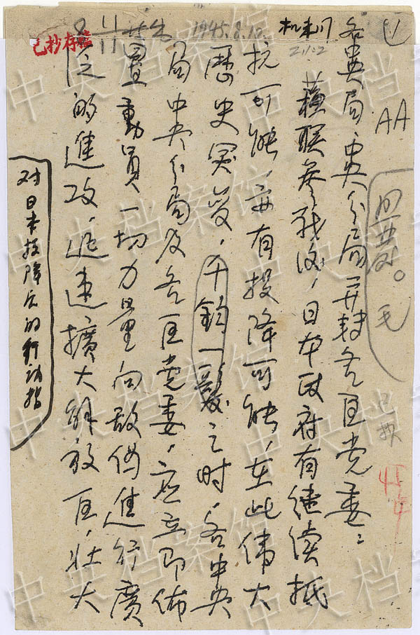 On August 10, the Central Committee of the Communist Party of China gave instructions to make massive attacks against the Japanese-occupied cities and roads and take control of these cities and roads since the Soviet Union’s participation in China’s war against Japanese aggression. (Photo/China's State Archives Administration)